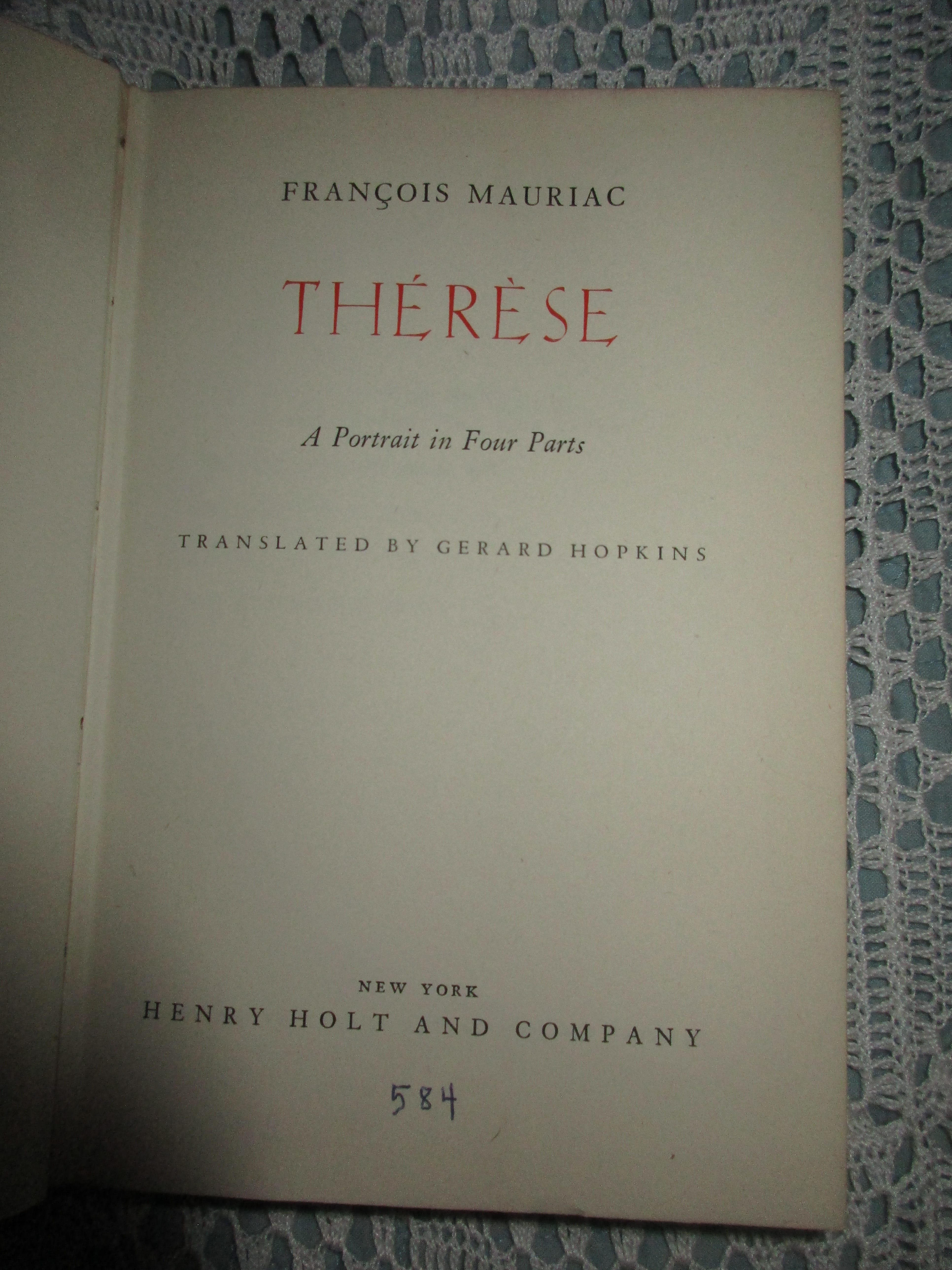 This is the first book I’ve read by Mauriac, and it makes me want to read others. This was/is not an easy book, because it concerns a heinous crime, forgiveness and lack of forgiveness, mortal sin, broken relations, and death. In part it is like Graham Greene’s books, where we are often left wondering if a character may have condemned himself to the flames of hell. Therese: A Portrait in Four Parts by Francois Mauriac (NY: Henry Holt, 1947 first printing, hc w/school markings). Re-published in full by Cluny.