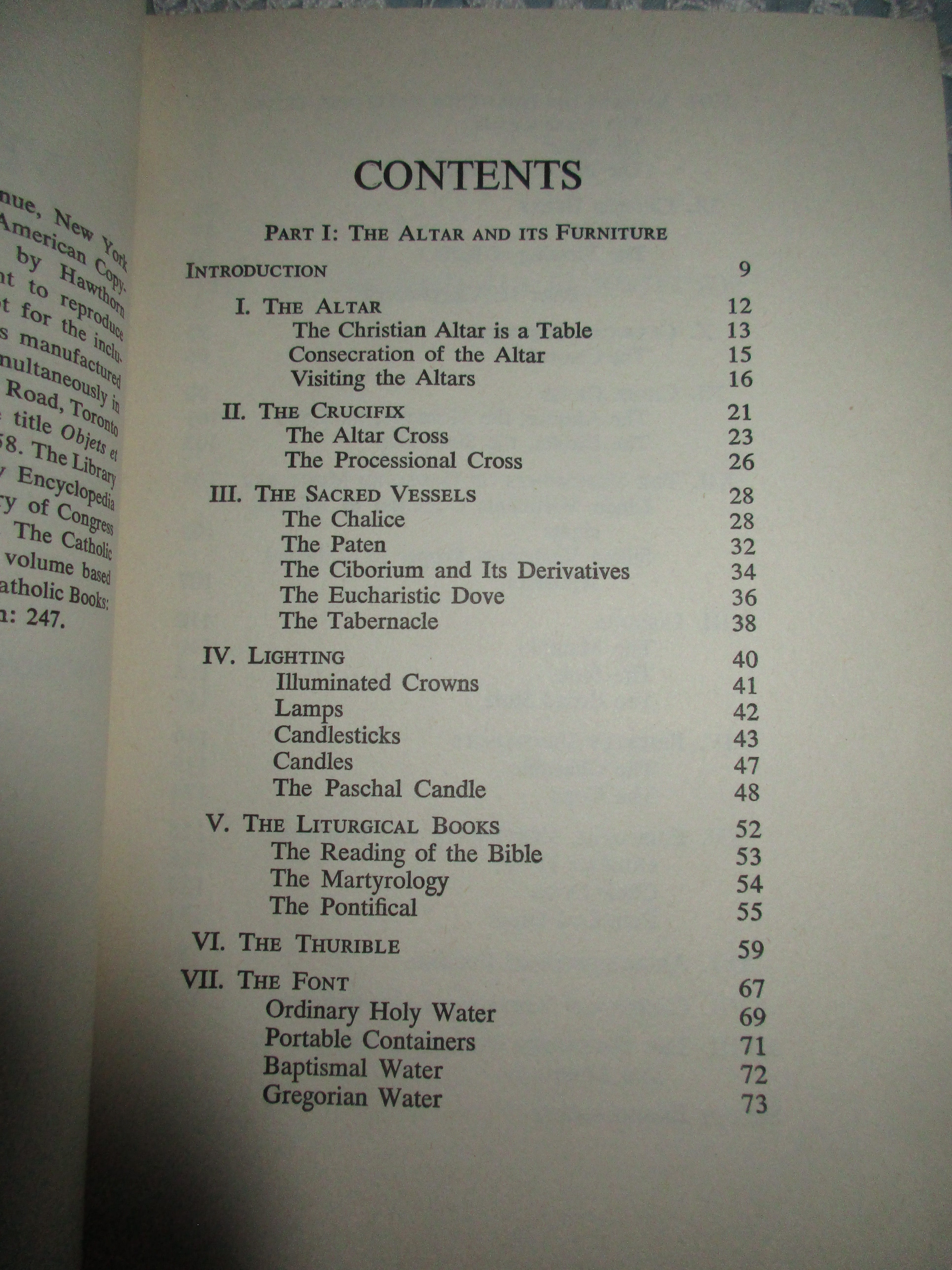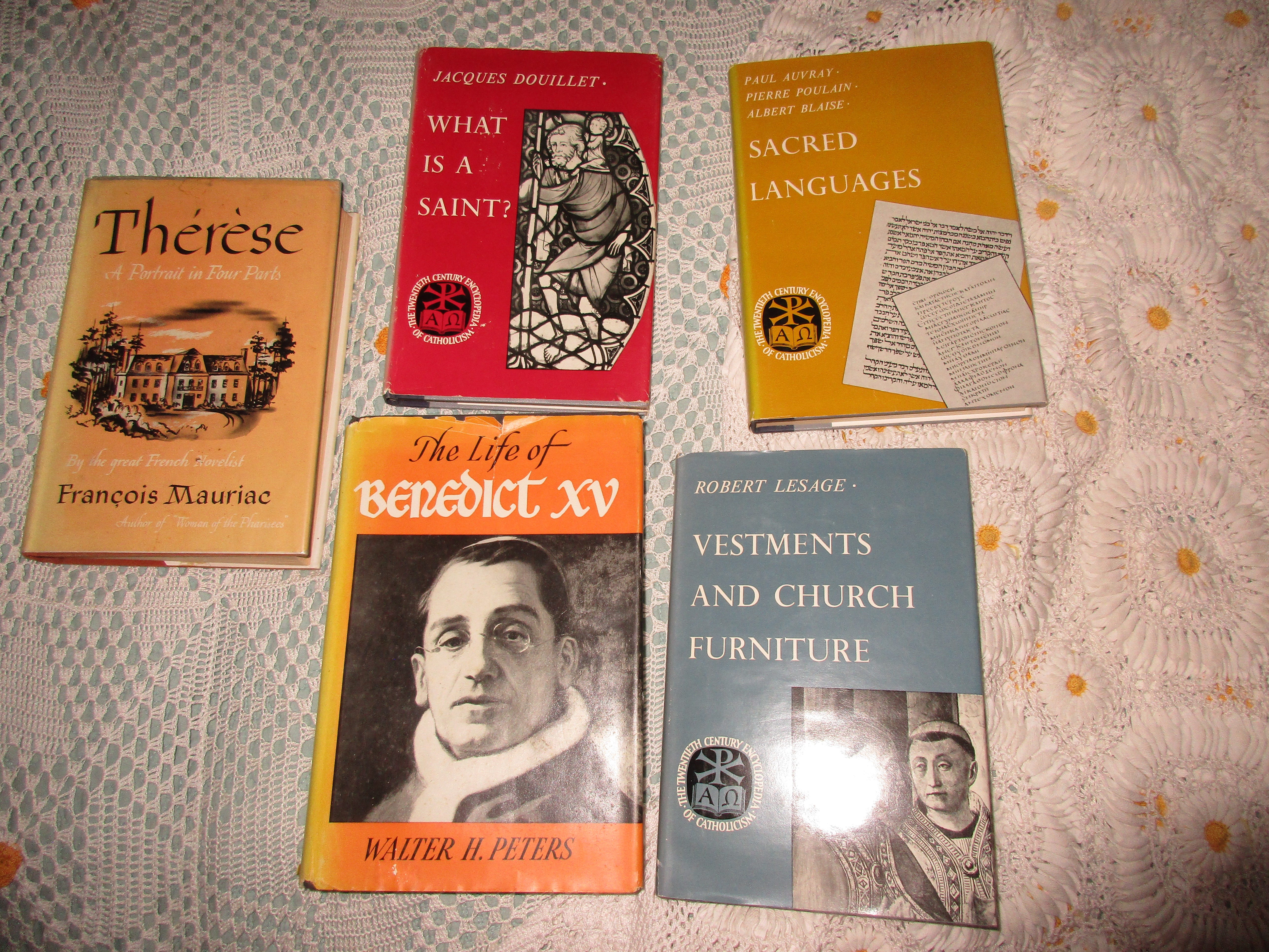 “Here, in one volume, is a guidebook to the interiors of churches and the significance of the dress of the priesthood” (from the inside cover). Vestments and Church Furniture by Robert Lesage (NY: Hawthorn, 1960, hc, 1959 imprimatur, #114 in the series). The author served as MC for the Archbishop of Paris.