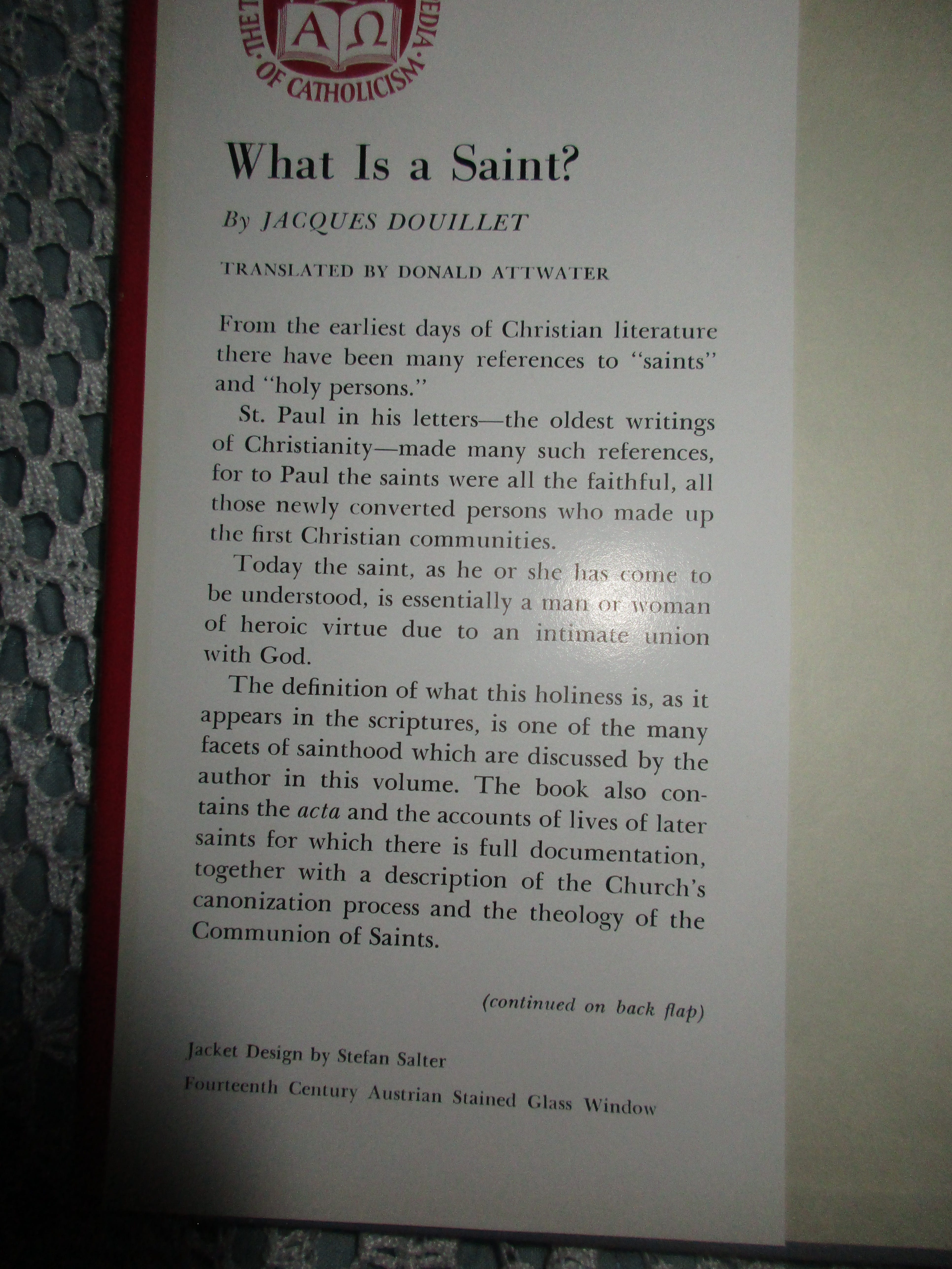 What Is a Saint? by Jacques Douillet (NY: Hawthorn, 1958, hc, 1958 imprimatur, #46 in series). A good brief introduction to the Catholic Church’s teaching on saints, including well-known examples of saints, canonization process (before JPII’s changes), relics, veneration, and more.