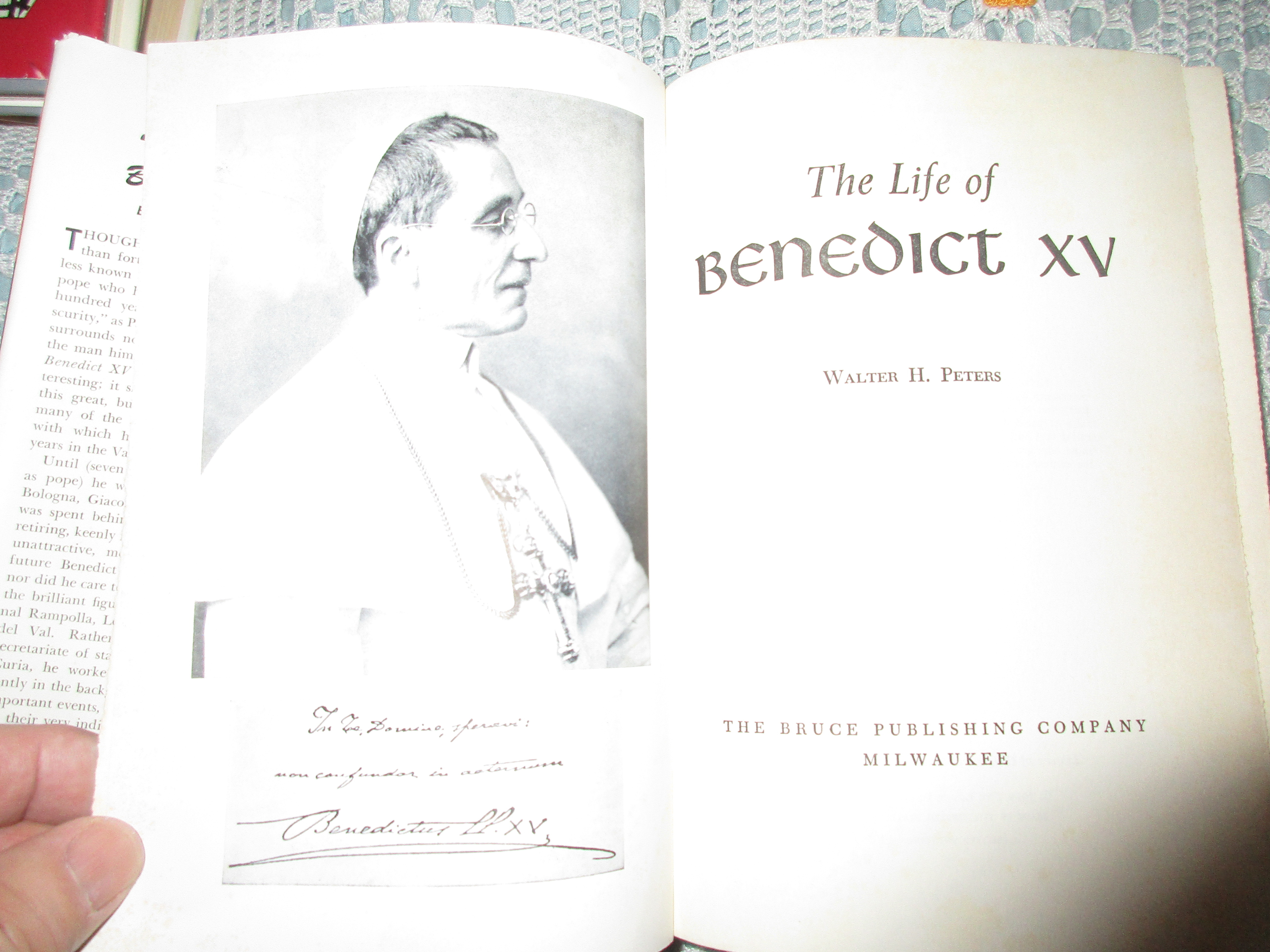 Benedict XV is not a well-known modern pope. He was overshadowed by his predecessor (St. Pius X) and successors (Pius XI and XII). While he is noteworthy for his efforts to intervene on behalf of peace during WWI, and for his promulgation of the 1917 Code of Canon law (mostly done on Pius X’s watch), he has no monumental encyclicals attached to his legacy. This book, The Life of Benedict XV by Walter H. Peters (Milwaukee: Bruce Publishing, 1959, hc, 1959 imprimatur) reveals this lesser-known pope’s distinguished ecclesiastical career and a papacy of integrity.