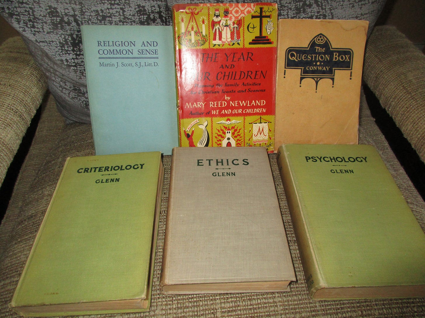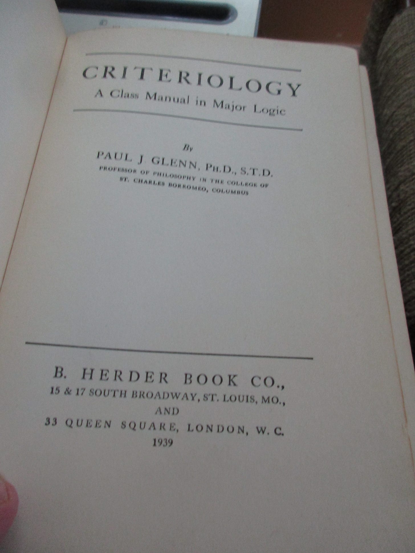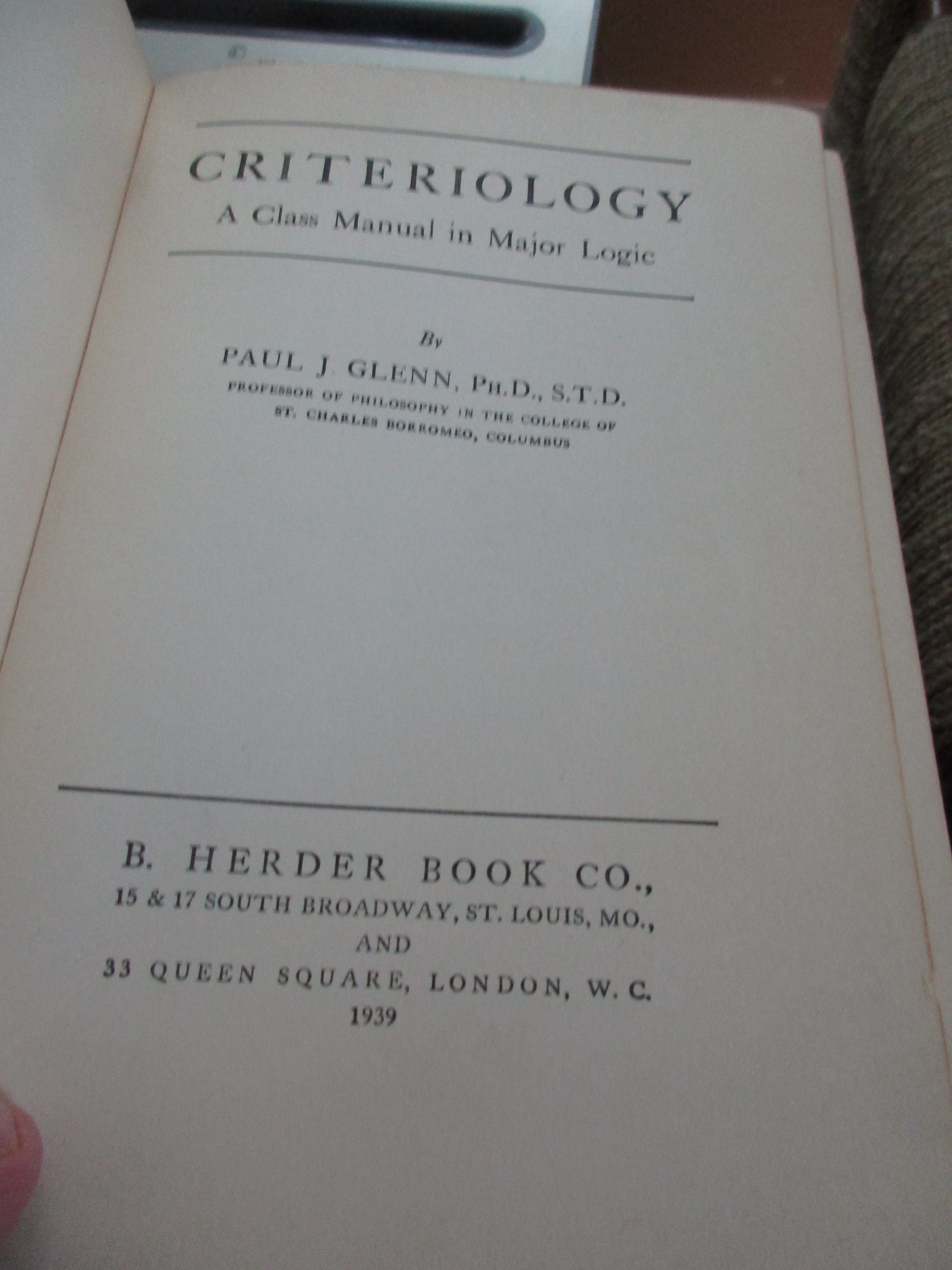 Here is one of three textbooks featured today: Criteriology: A Class Manual in Major Logic by Paul J. Glenn (St. Louis, MO: B. Herder, 1939, cloth, imprimatur). Not bed-time reading.