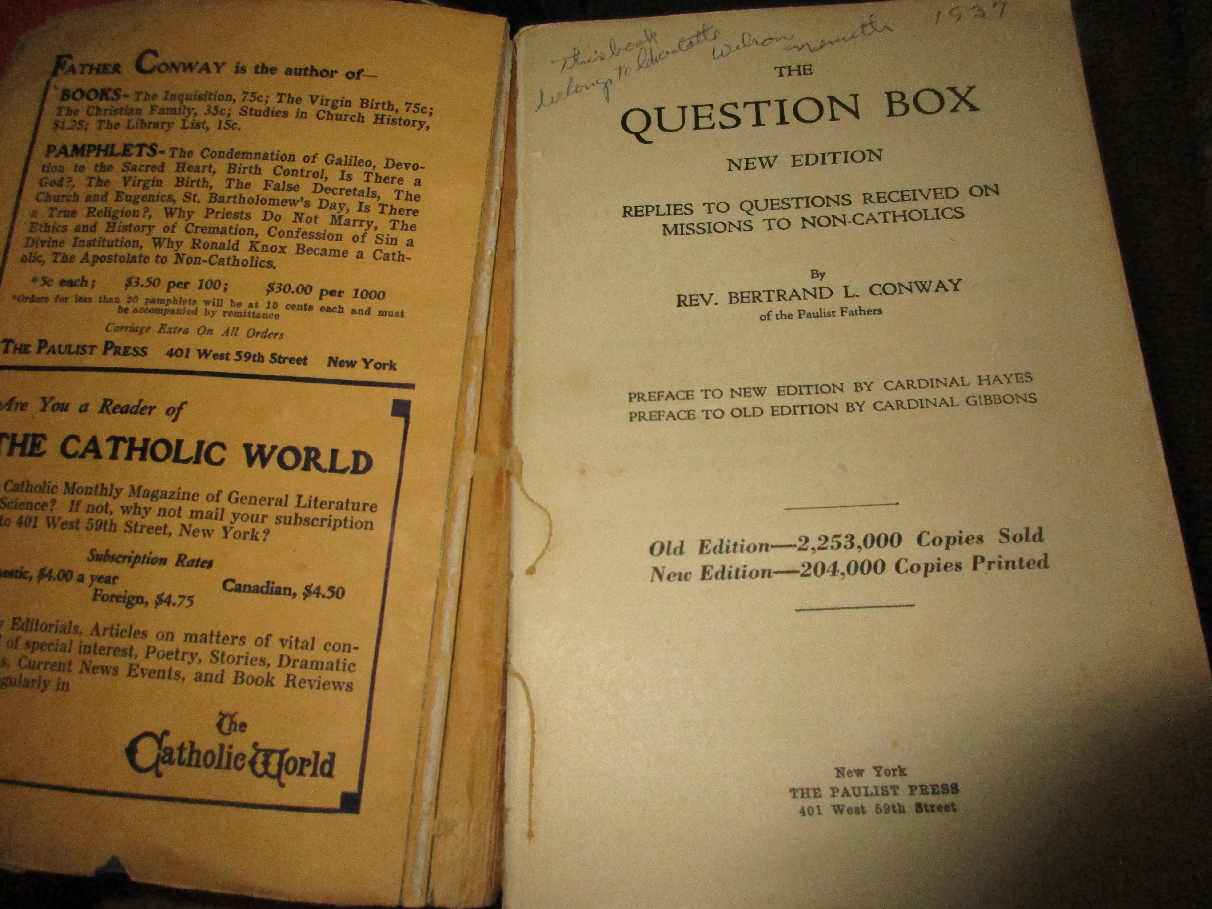 Imagine a Church interested in reaching out to those outside with solid answers to questions on the Faith. A missionary Church, not one of indifferentism or false ecumenism. Here we see The Question Box (New Edition): Replies to Questions Received on Missions to Non-Catholics by Rev. Bertrand Conway (NY: The Paulist Press, 1929, sc, Cdl. Hayes imprimatur). No holds barred. There are even questions and answers on the suppression of the Jesuits, the St. Bartholomew’s Day Massacre, and Galileo. Originally published in 1909. More info at Open Library website. Available in 1962 edition.