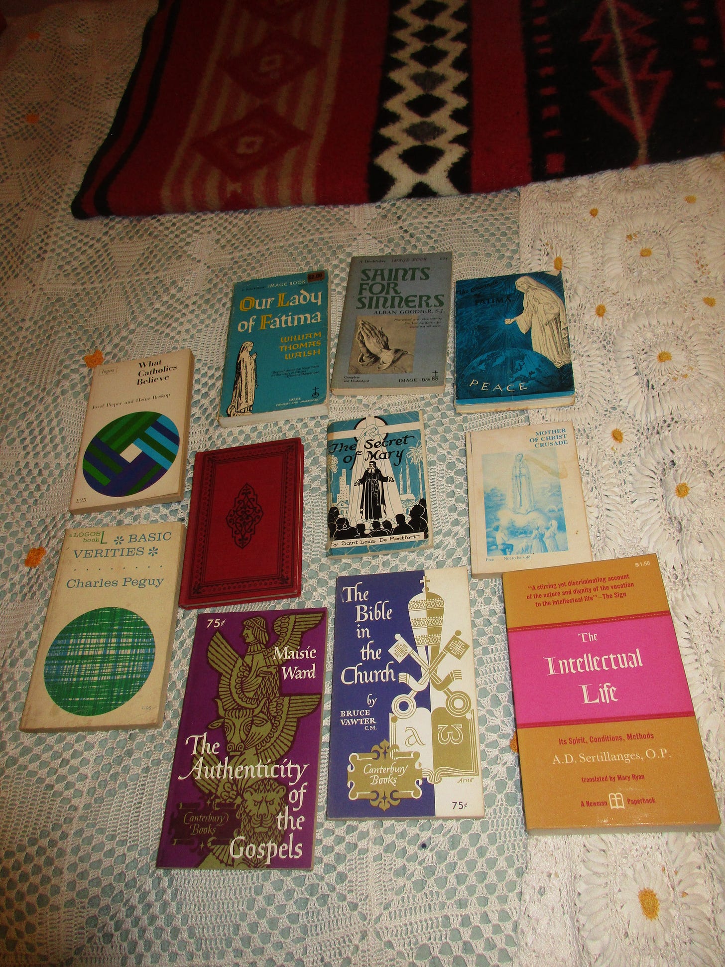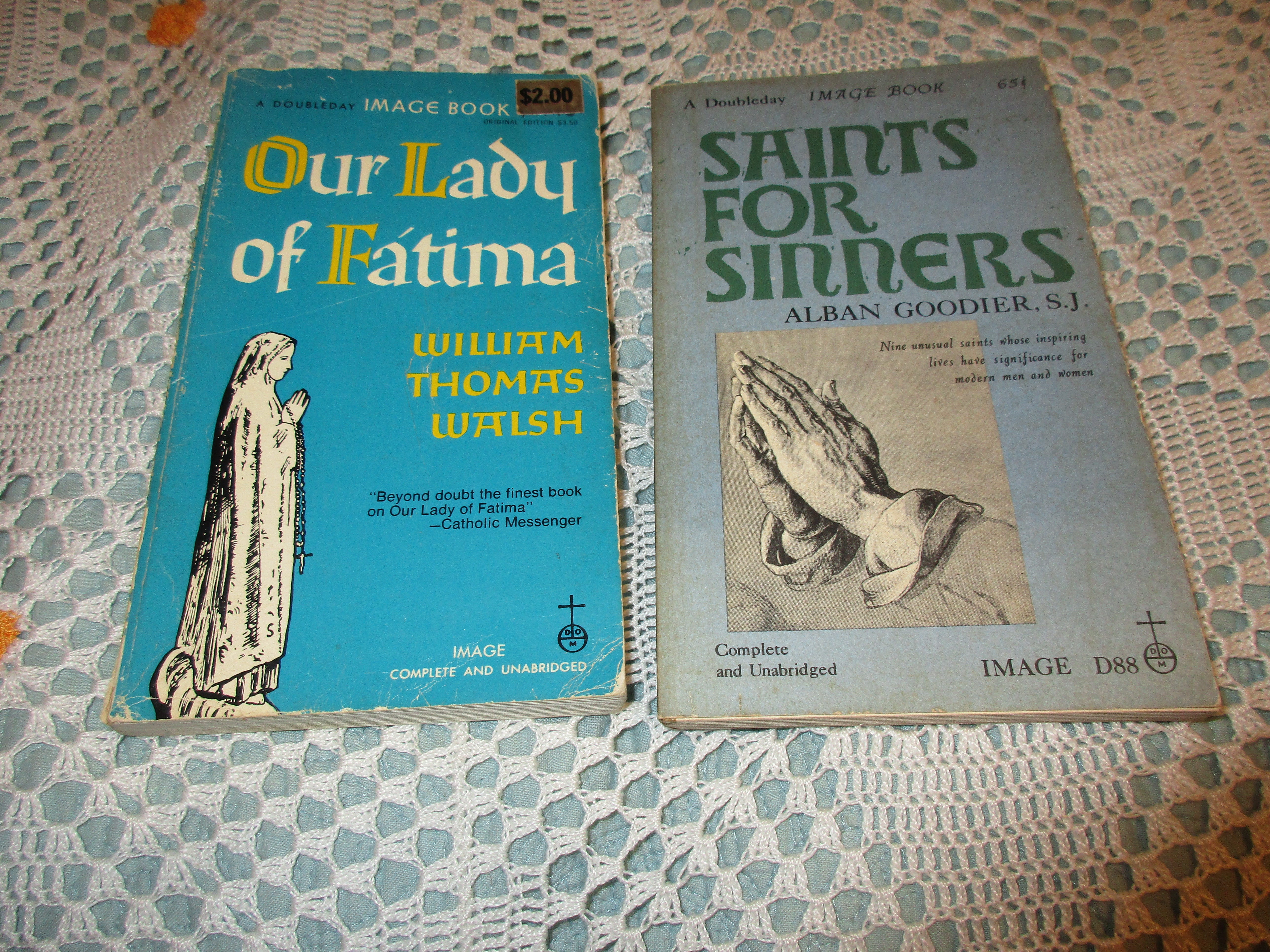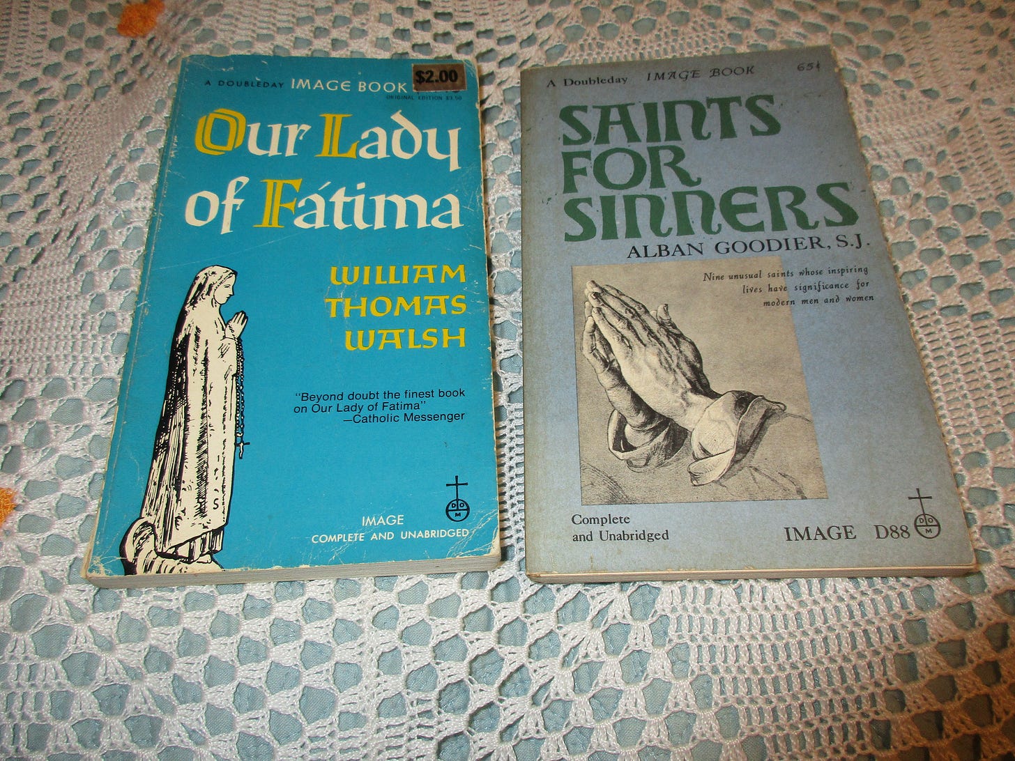 Two from Image: Our Lady of Fatima by William Thomas Walsh (Garden City, NY: Image, 1954, pb, 1947 Cdl. Spellman imprimatur). A thorough investigation (up to that time) into the apparitions, etc.; Saints for Sinners by Alban Goodier, SJ (Garden City, NY: Image, 1960, pb). From the back cover: “This is a collection of [nine] sensitively drawn prose portraits of human beings whose temptations, flaws, struggles and failures bear striking similarity to the weaknesses and defects experienced in this modern era.” Back in print with Sophia.