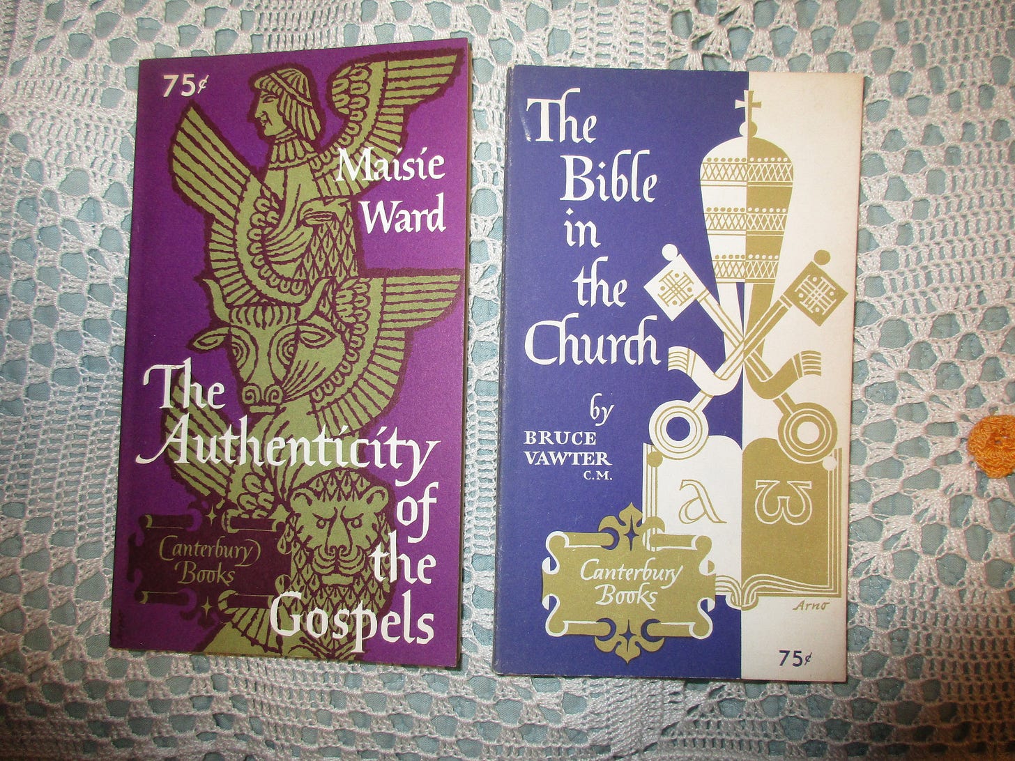 Canterbury Books was an imprint of Sheed & Ward and were excerpted from longer works. First, The Authenticity of the Gospels by Maisie Ward (NY: Sheed & Ward, 1956, pb, 1955 imprimatur). Chapters on the Gospels as a whole, plus individual ones on the authors, history, etc. Link to the book on Internet Archive. Then, The Bible in the Church by Bruce Vawter C.M. (NY: Sheed & Ward, 1959, pb, 1958 imprimatur). Three chapters: “Who Closed the Open Bible?”; “The Rule of Faith”; and, “The Bible in the Church.” Link on internet archive.