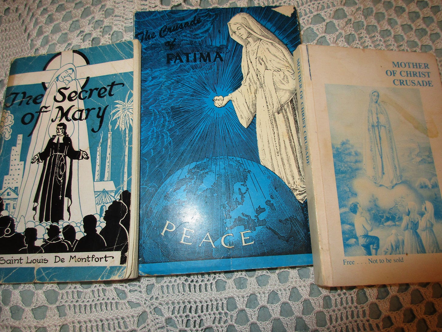 The Secret of Mary by Saint Louis De Montfort (Bay Shore, NY: The Montfort Publications, 1950, pb, 1947 imprimatur). In print now with TAN. The Crusade of Fatima by John De Marchi, IMC (Coimbra, Portugal: 1964, pb, 1947 imprimatur). Here. Mother of Christ Crusade by John De Marchi IMC (Billings, MT: Mother of Christ Crusade, n.d., pb, 1947 imprimatur). Kindle version here.