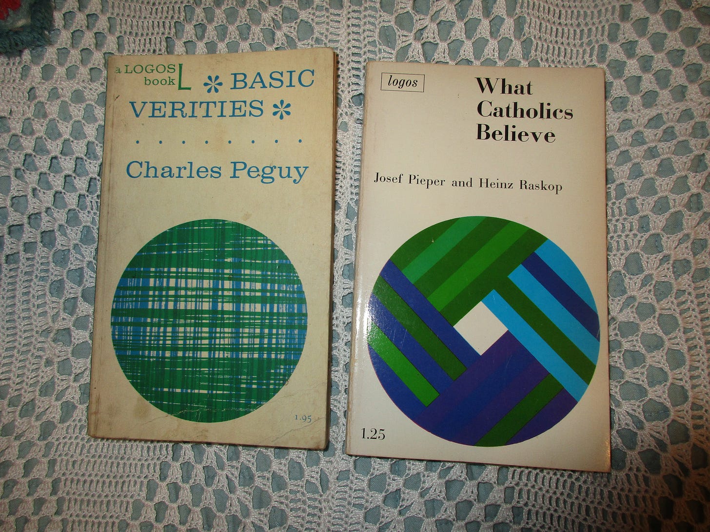 The Logos imprint was put out by Regnery. (Side note: I just read that Regnery has been sold to…Hachette? No. Actually to Skyhorse, with which I was familiar through RFK, Jr’s The Real Anthony Fauci, guaranteed to raise your blood pressure while depressing your spirits.) Whether or not the sale is a good thing remains to be seen. Regnery was a reliably conservative publisher. Basic Verities (Chicago: Regnery, 1965, pb, French/English) by Charles Peguy contains both poetry and prose. Back in print from Cluny. What Catholics Believe by JosephPieper and Heinz Raskop (Chicago: Regnery, 1966, pb, 1951 imprimatur). After an introduction there is a prayer to St. Thomas Aquinas to help the reader learn from the text. Also back in print from Cluny.
