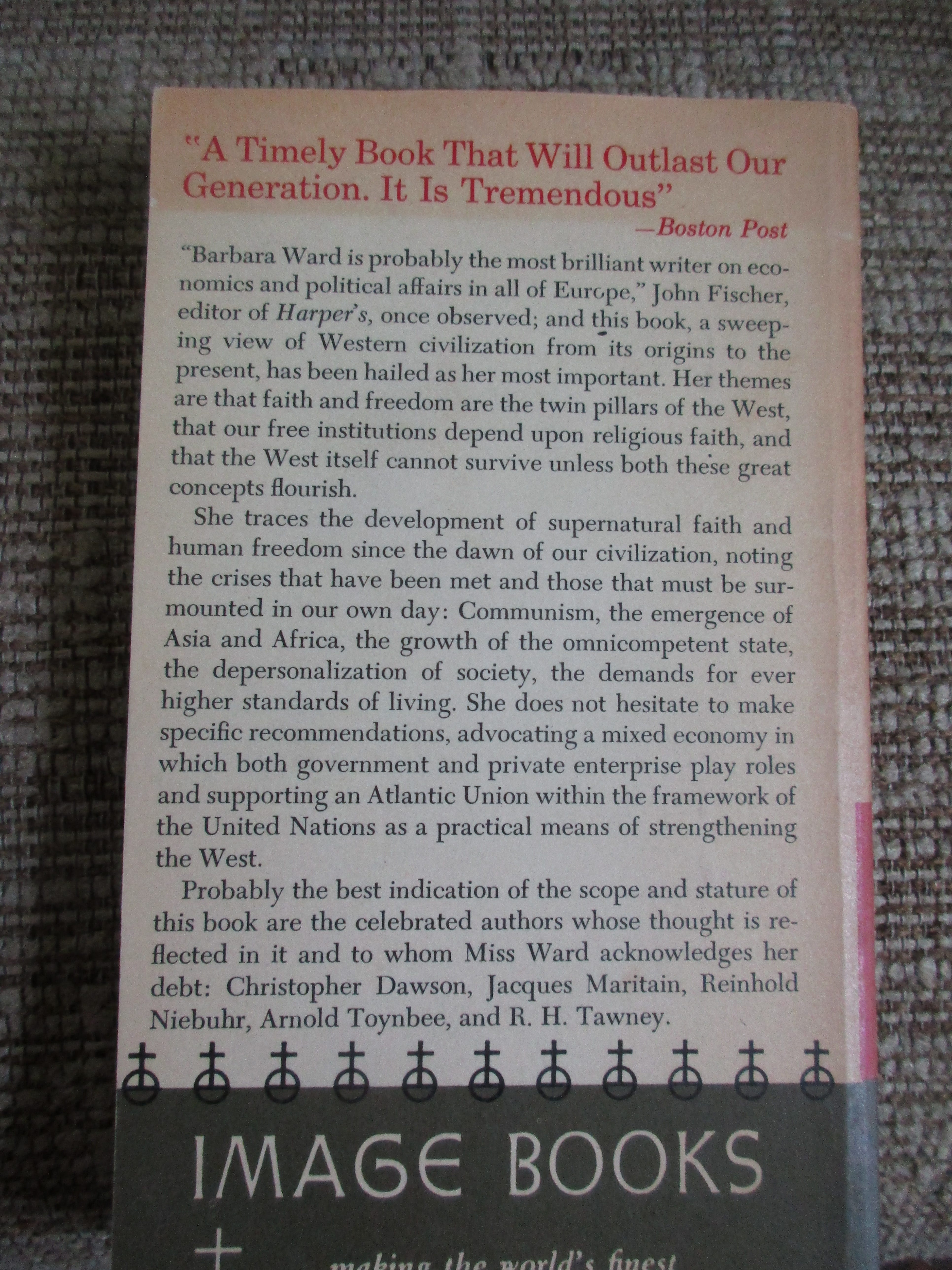 Faith and Freedom by Barbara Ward (Garden City, NY: Image Books, 1958, pb). At Thriftbooks. Ward is not an author I’d been familiar with before encountering this book.