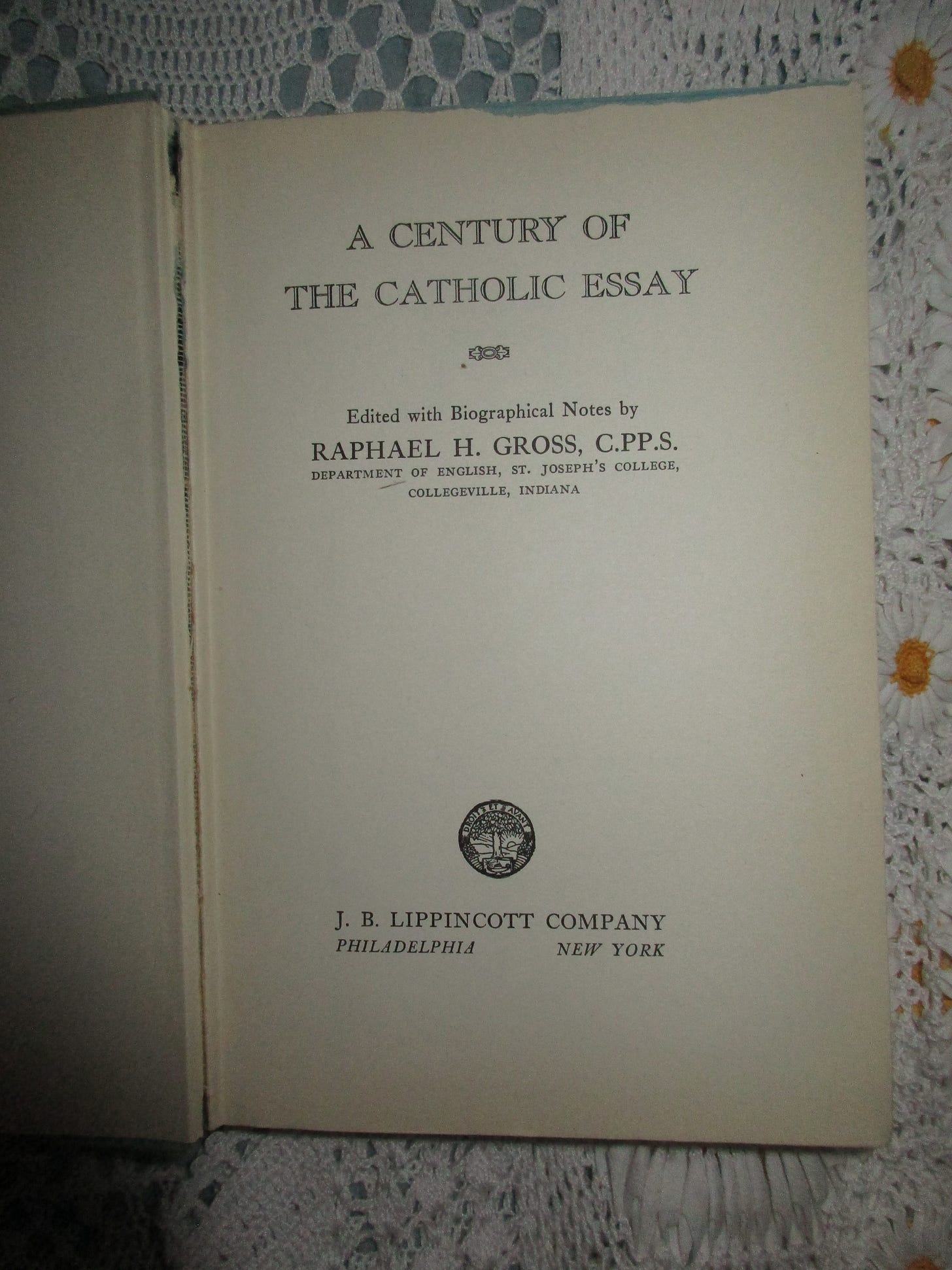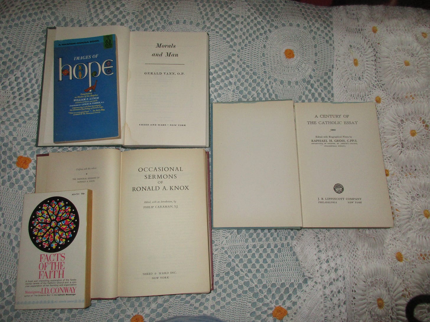 Good, solid writing abounded. For example: The Occasional Sermons of Ronald A. Knox NY: Sheed & Ward, 1960, cloth, 1960 imprimatur). Fr. Knox was a spirited and skillful writer and homilist, as these sermons illustrate. He had a gift for explanation. Reprinted by Cluny. In the same league: Morals and Man by Fr. Gerald Vann, O.P. (NY: Sheed & Ward, 1960 revised edition, cloth, 1959 imprimatur). Vann, a Dominican, was also a gifted explainer. In this particular book Vann shows himself worthy to wear the same habit as Aquinas, not because of a like profundity, but due to the clarity in thought. (Here.) The breadth of Catholic talent and depth of thought is on display in A Century of the Catholic Essay, Raphael Gross (ed.) (Philadelphia: J.B. Lippincott, 1946, cloth, 1946 imprimatur) with essays from Newman, Knox, Belloc, Sheen, Baring, and many others. On Internet Archive. Adding to the host of solid introductions to Catholicism is Facts of the Faith by Msgr. J.D. Conway (NY: All Saints Press, 1959, pb, 1959 imprimatur). On Amazon.