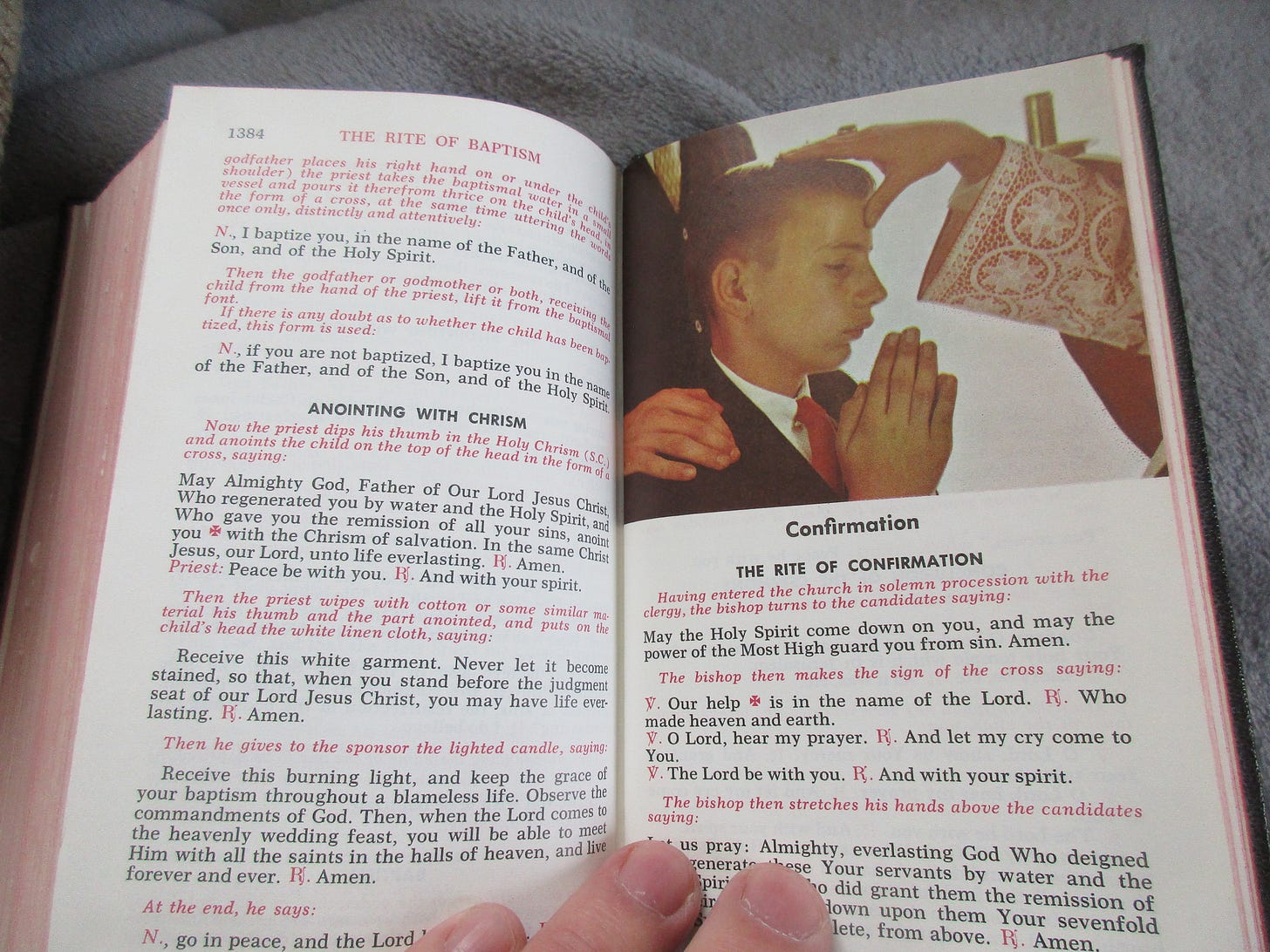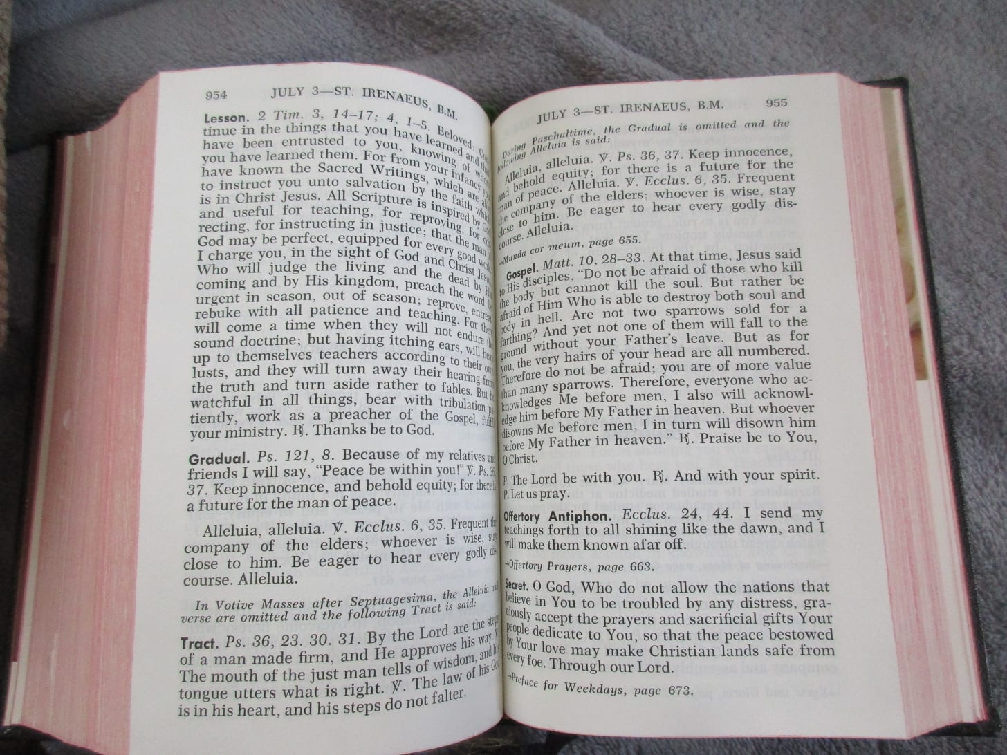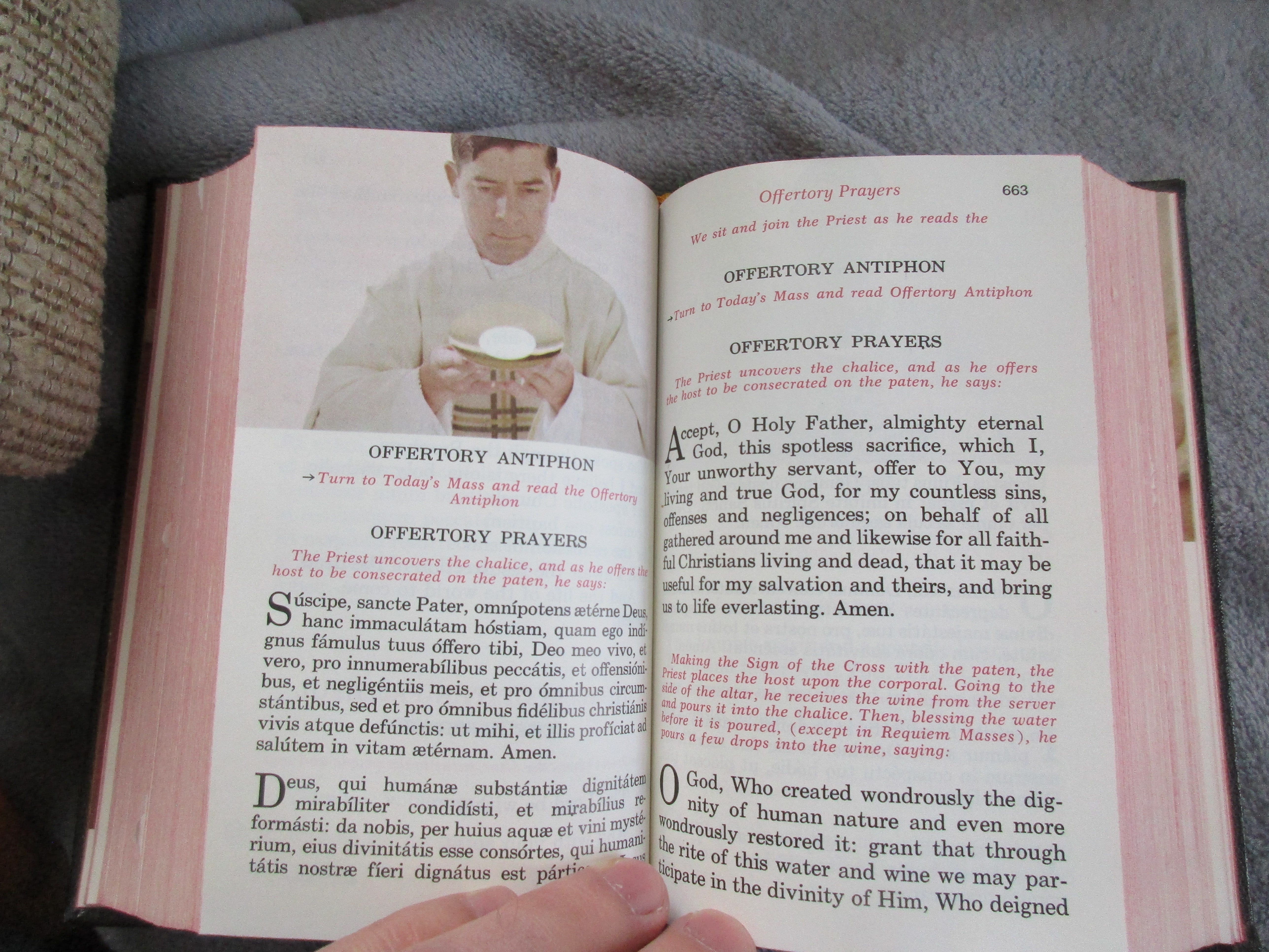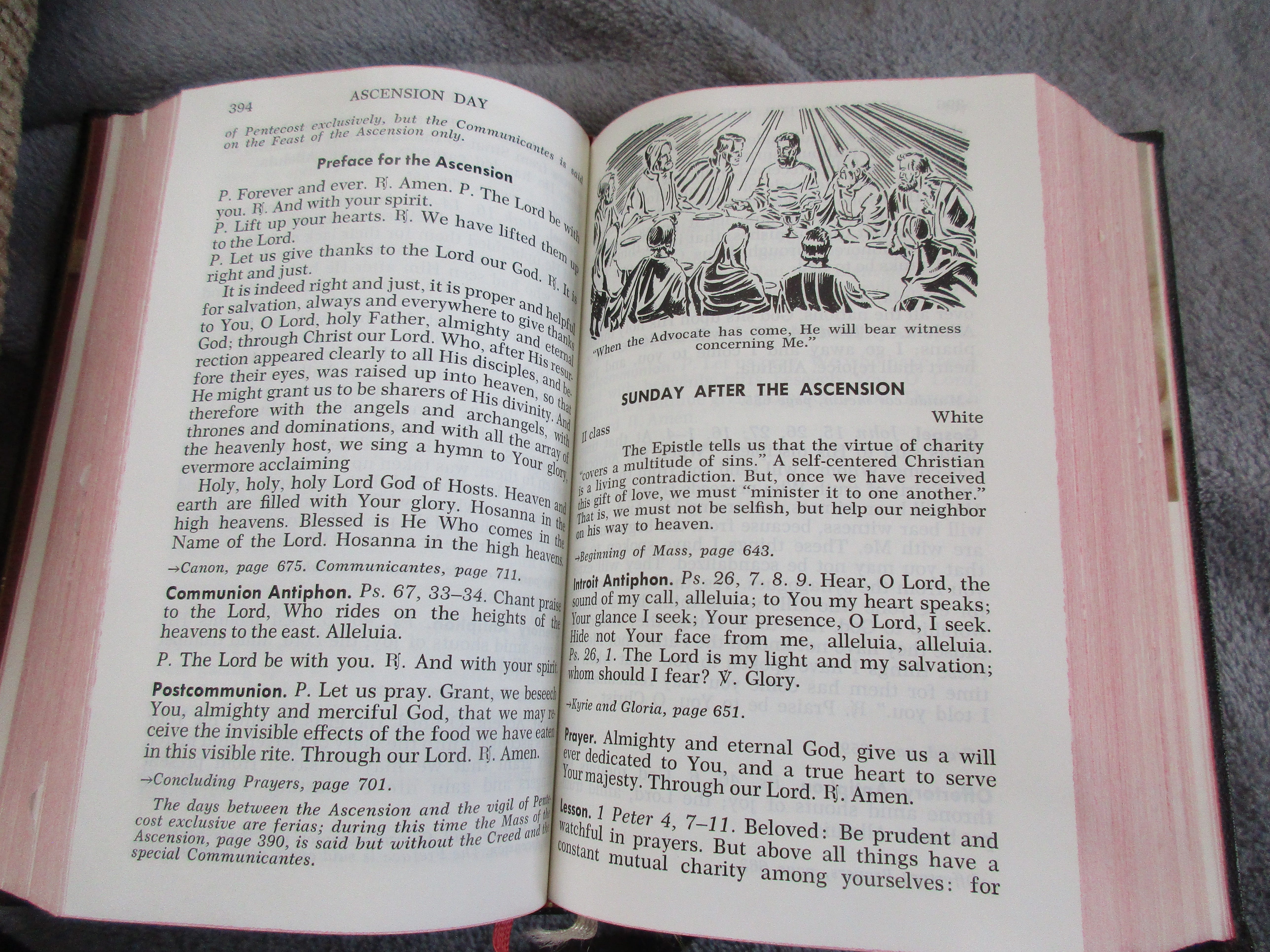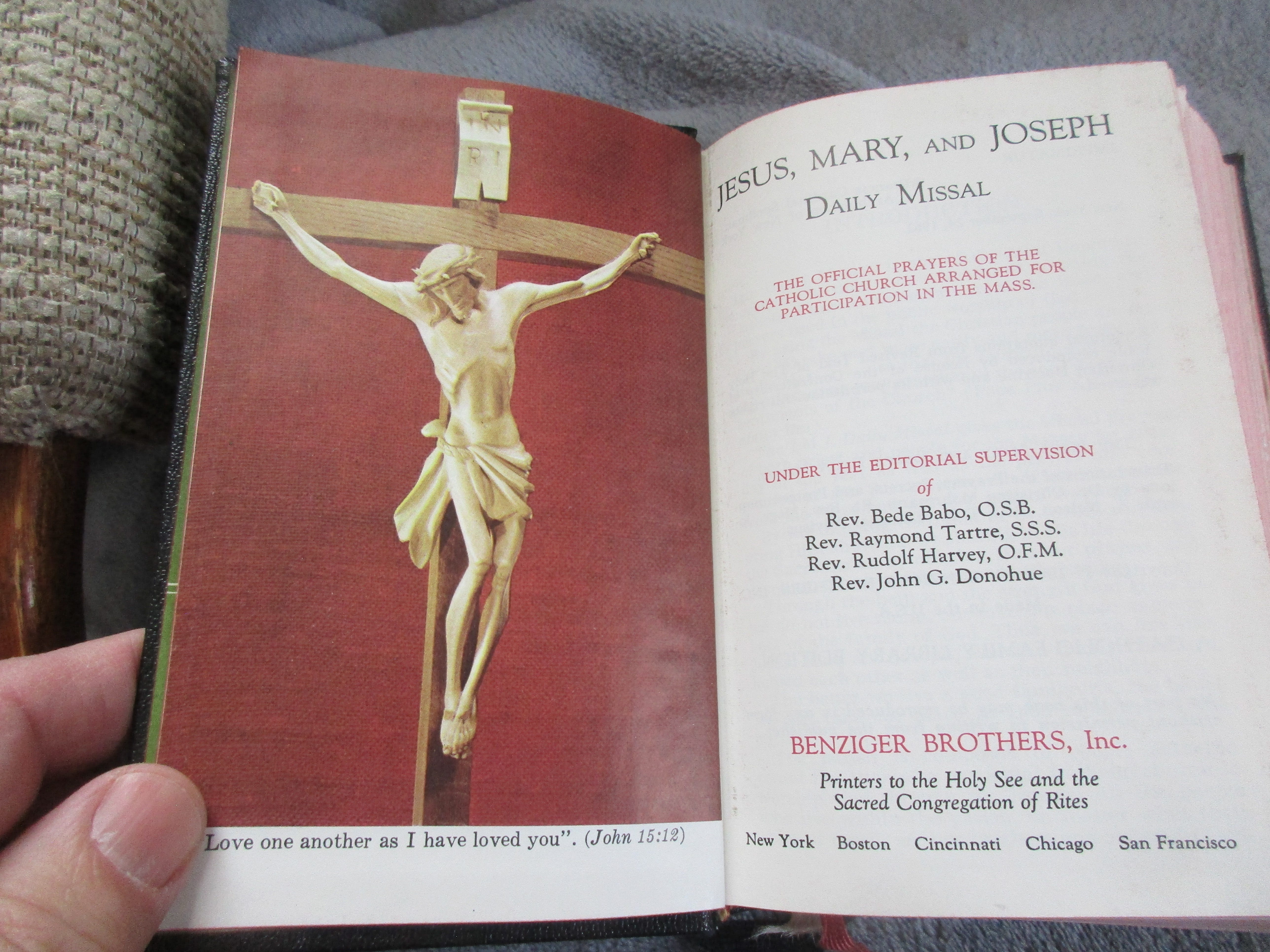 Next up is a lovely 1962 daily Mass missal, Jesus, Mary, and Joseph Daily Missal (N.Y.: Benziger Brothers, 1962, hc). Cardinal Spellman imprimatur. This has some nice features, including the participation of noted Latin scholar Dr. Christine Mohrmann, who translated many of the prayers. (Fr. John Hunwicke sings her praises quite often.) There are some okay drawings and also color pictures. What I don’t like is that most of the readings are in English only, though the fixed parts of the Mass are given in both Latin and English. I don’t take this one to church but I do use it at home for readings and prayers. I purchased this on Ebay. The ribbons have quite a bit of wear, and yet there were still some uncut pages! It has not been reprinted to my knowledge. There are copies available, especially on Ebay. Pictures: