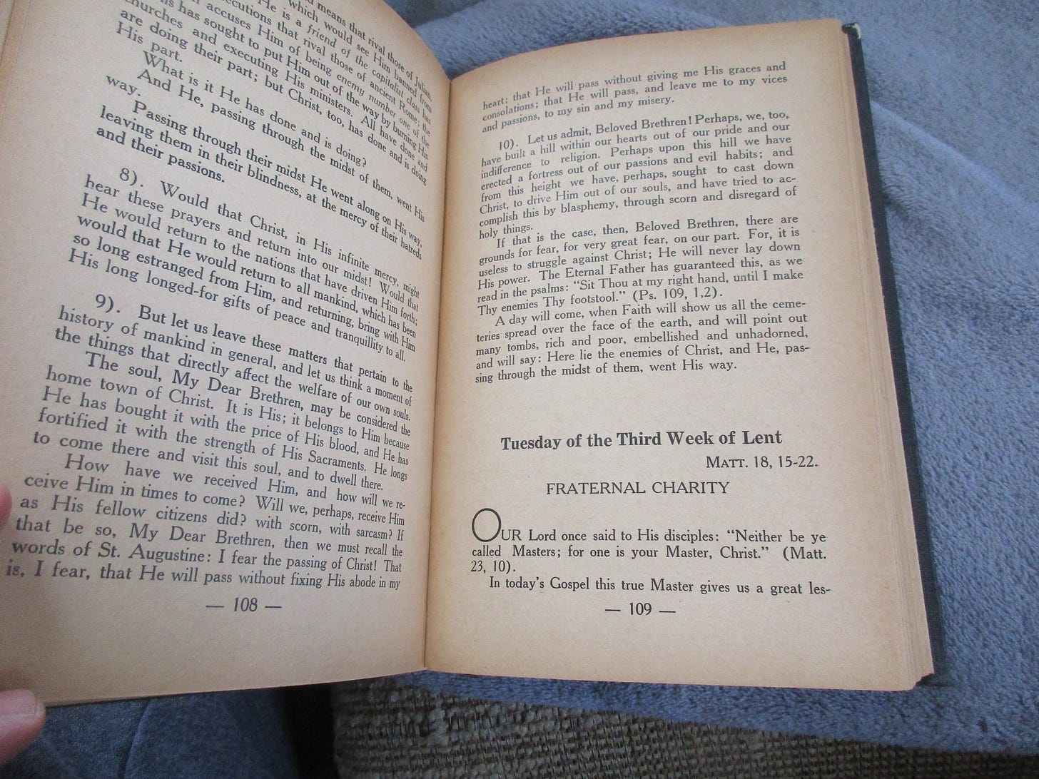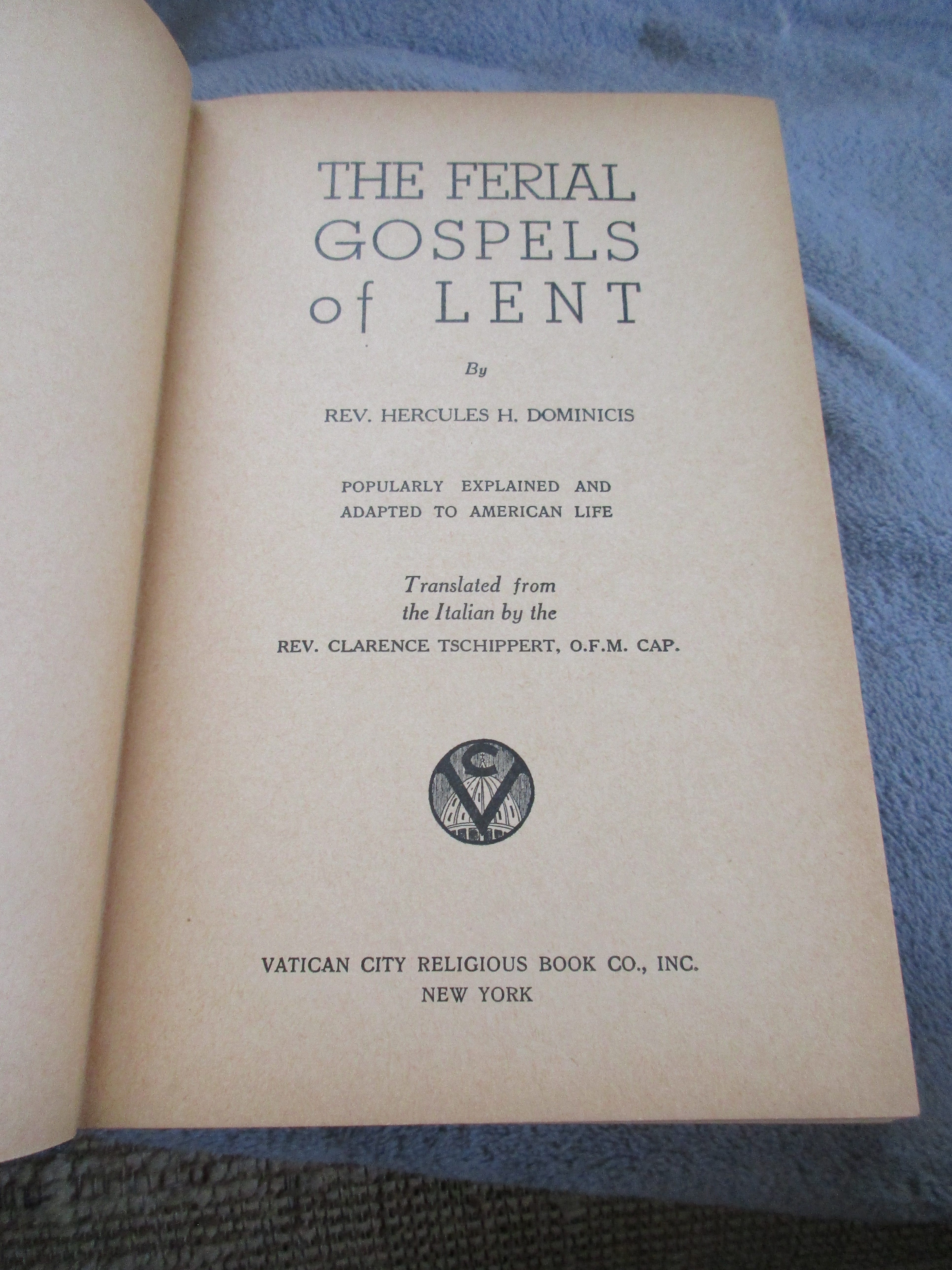 Next up, The Ferial Gospels of Lent by Rev. Hercules H. Dominicis, trans. Rev. Clarence Tschippert, OFM, Cap. (N.Y.: Vatican City Religious Book Company, 1944). Amazon has this one listed as out-of-print. Hardcover book produced during WWII with yellowing paper. Imprimatur by Abp. Spellman. This is an example of a good and useful book. Caveat: It does not contain the actual Gospel readings, just commentary. These are pretty good sermons on the daily Gospels from Lent, Passiontide, and Holy Week. I got this from Philadelphia bookseller Steve Vranizan, who advertises in Catholic Family News. Pictures: