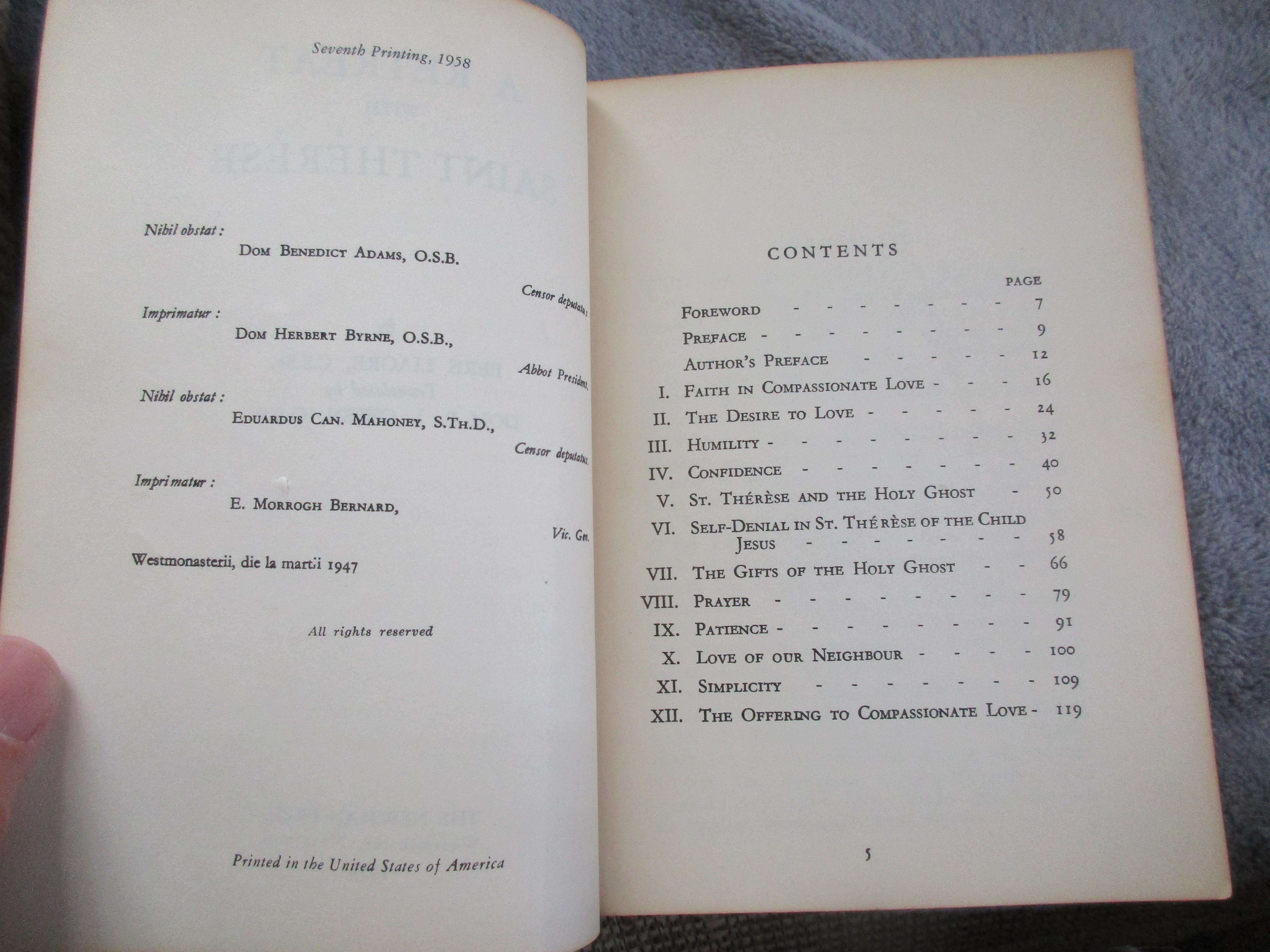 Finally, I present an older edition of a book which has been reprinted (2014): A Retreat with St. Therese by Pere Liagre, C.S.Sp. (Westminster, MD: Newman Press, 1958, pb). 1947 imprimatur. It’s easy to think that St. Therese has been overdone, but I find there is a great depth to her thought—I look forward to putting this little book to use. Newman Press was another great producer of excellent Catholic material. Picture: