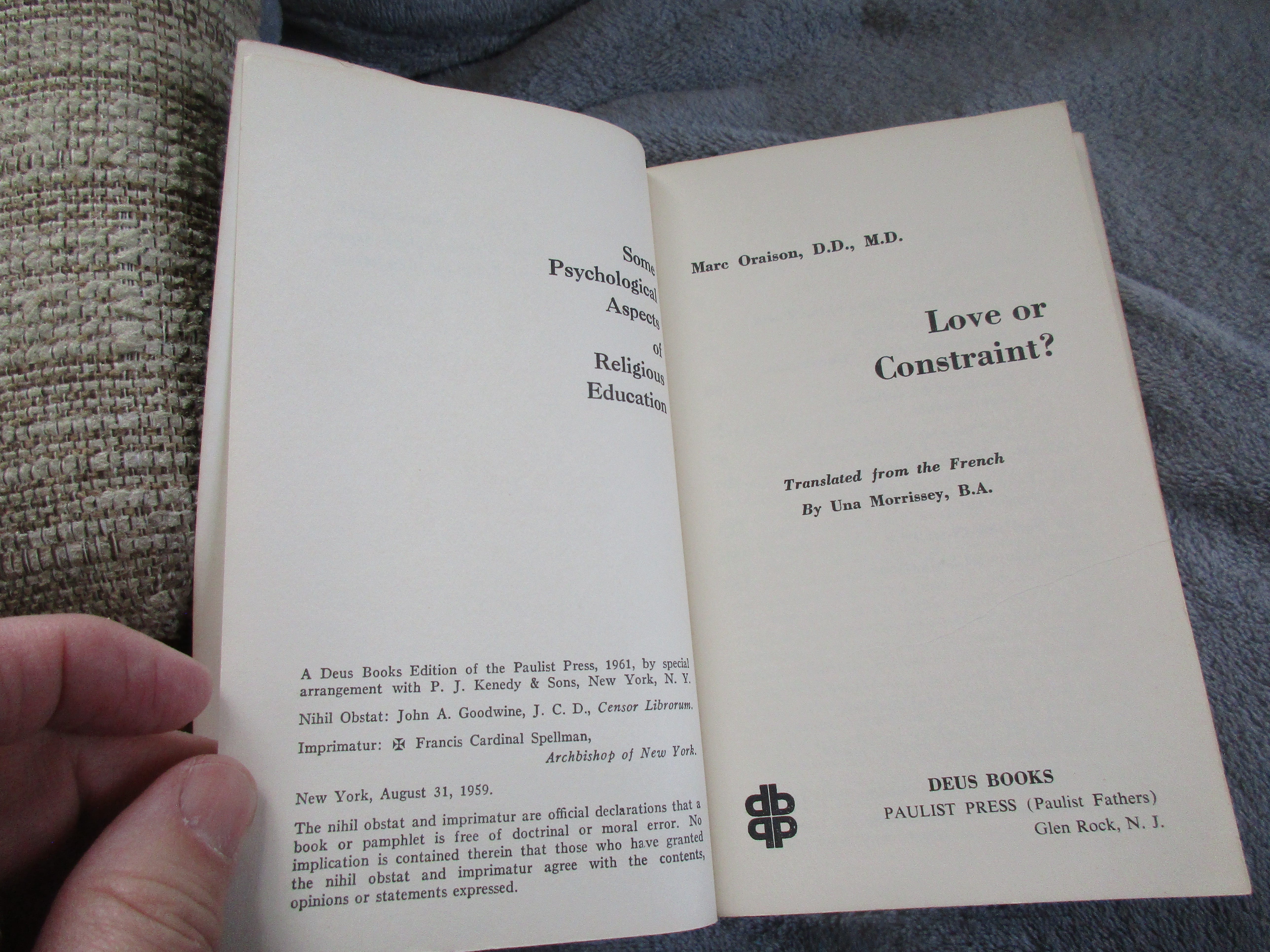 So far I’ve had positive things to say about the books I’m showing, but the next one might fall into the “Oh Dear” category: Love or Constraint? Some Psychological Aspects of Religious Education by Marc Oraison, D.D., M.D. (Glen Rock, NJ: Paulist, 1961, pb). Cdl. Spellman imprimatur. Translated from the French. The author early on asserts that Revelation begins with narcissism (29). Even a cursory glance shows this to be a modernistic book replete with psychologizing at the expense of traditional dogma. Copies available on Amazon. Picture:
