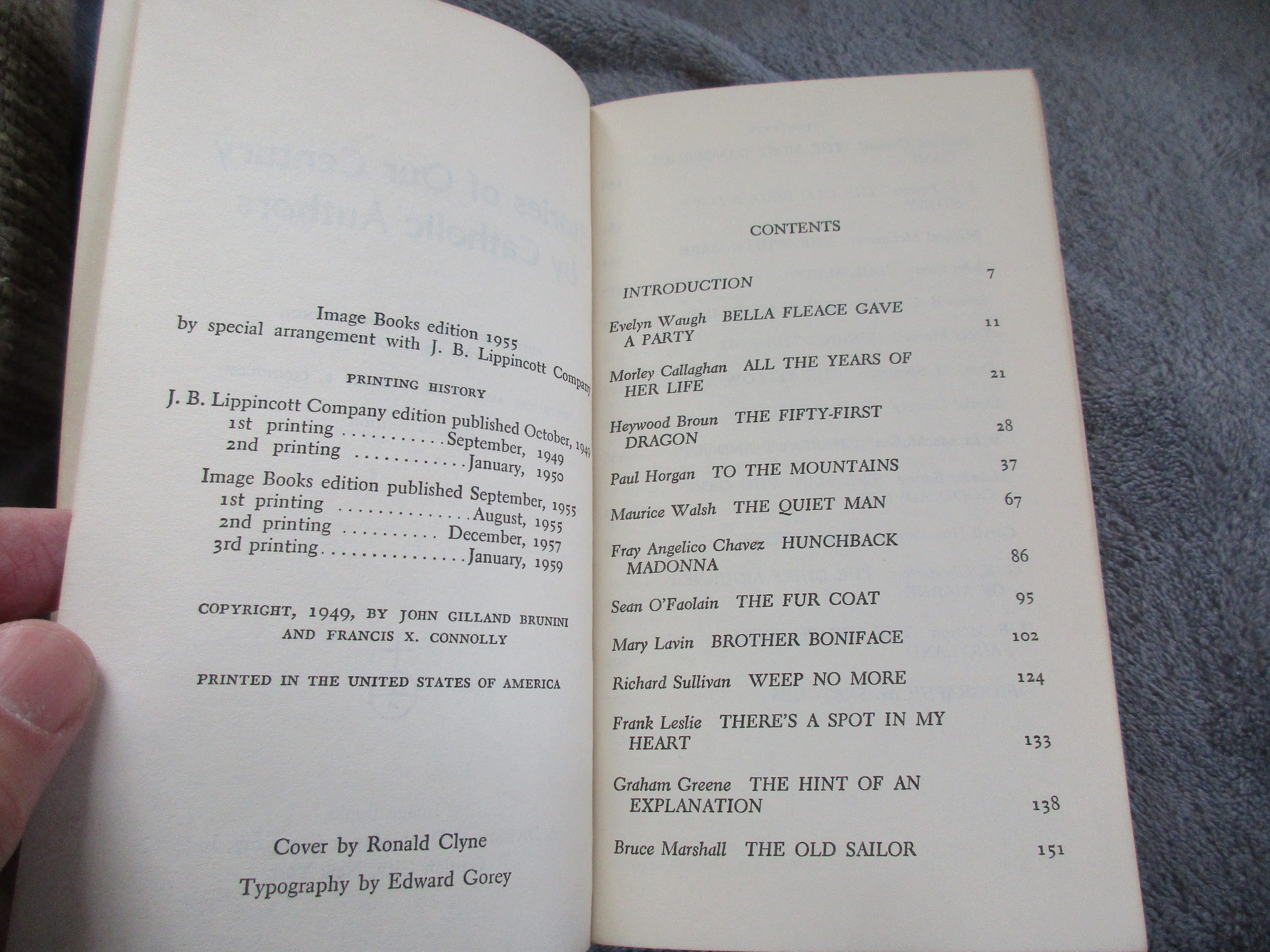 The first book is Stories of Our Century by Catholic Authors, edited by John Gilland Brunini and Francis X. Connolly (Garden City, N.Y.: Image Books, 1955, pb). Love Image Books paperbacks. They are a long-lasting product. This is a January, 1959 printing of a revised edition first published in 1949. This would be a great intro to Catholic writers, especially because it includes brief biographical sketches of all the authors. I don’t remember where I found this one. I live in a formerly strongly-Catholic region (Diocese of Ogdensburg, N.Y.) so there are still quite a few Catholic artifacts and books floating around. I don’t see that it has been reprinted; here is a link to one for sale on Amazon. Picture: